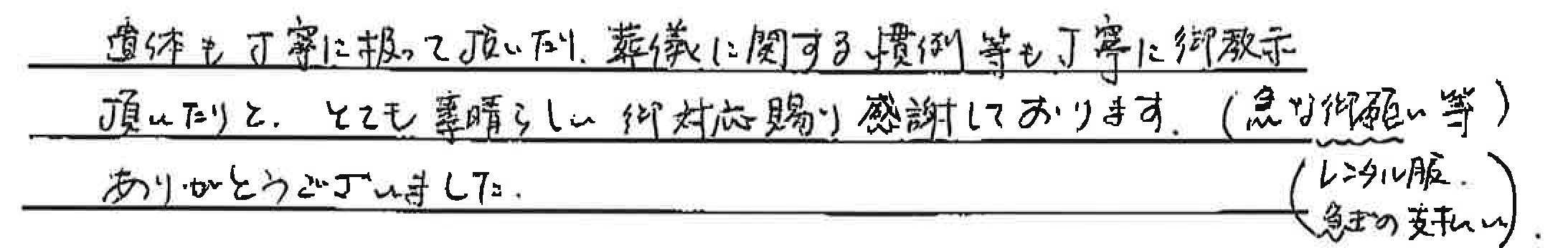 遺体も丁寧に扱ったり、葬儀に関する慣例等も丁寧に御教示頂いたりと、とても素晴らしい御対応賜り感謝しております