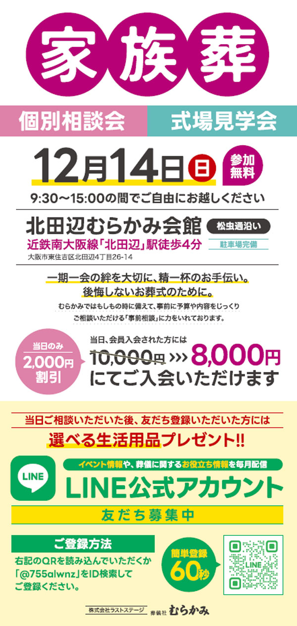 このたび、「北田辺むらかみ会館」にて、家族葬に関する個別相談会と式場見学会を開催いたします。